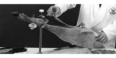 Paso 2.- Con el cuchillo ancho, se retira la corteza y el tocino exterior y se da un corte profundo en la caña. A partir de este corte, con el cuchillo jamonero se empieza a extraer lonchas de la maza, que es la parte mas gruesa de la pieza. Se aconseja combinar en cada ración lonchas de la zona central, con algunas de la punta y del codillo.