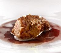 Pinchar para comprobar que el jugo que sale del interior es blanco y sacar del horno.Separar el redondo y servir la carne cortada en lonchas finas, envuelta con su salsa y acompañada de manzanas asadas o en compota, de puré de castañas o de puré de patatas, según gustos.