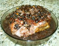 – Un poco antes de su total cocción se le agrega la cebolla cortada en láminas, las pieles de la naranja y del limón y el vino de Oporto por encima mas las pasas (remojadas previamente en el coñac).