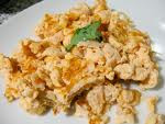 Se baten los huevos muy bien se sazona con sal y la salsa ketchup, se añaden al jamón y se pasan a la sartén, se remueven, cuando el huevo ha cuajado se retira.