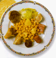 Una vez tiernos los garbanzos, sacar el caldo y hacer la sopa con fideos, sémola o arroz; servirla de primer plato. Hacer un refrito de ajos y agregarlo al repollo. Servir los garbanzos junto con las carnes troceadas y las verduras, como segundo plato.