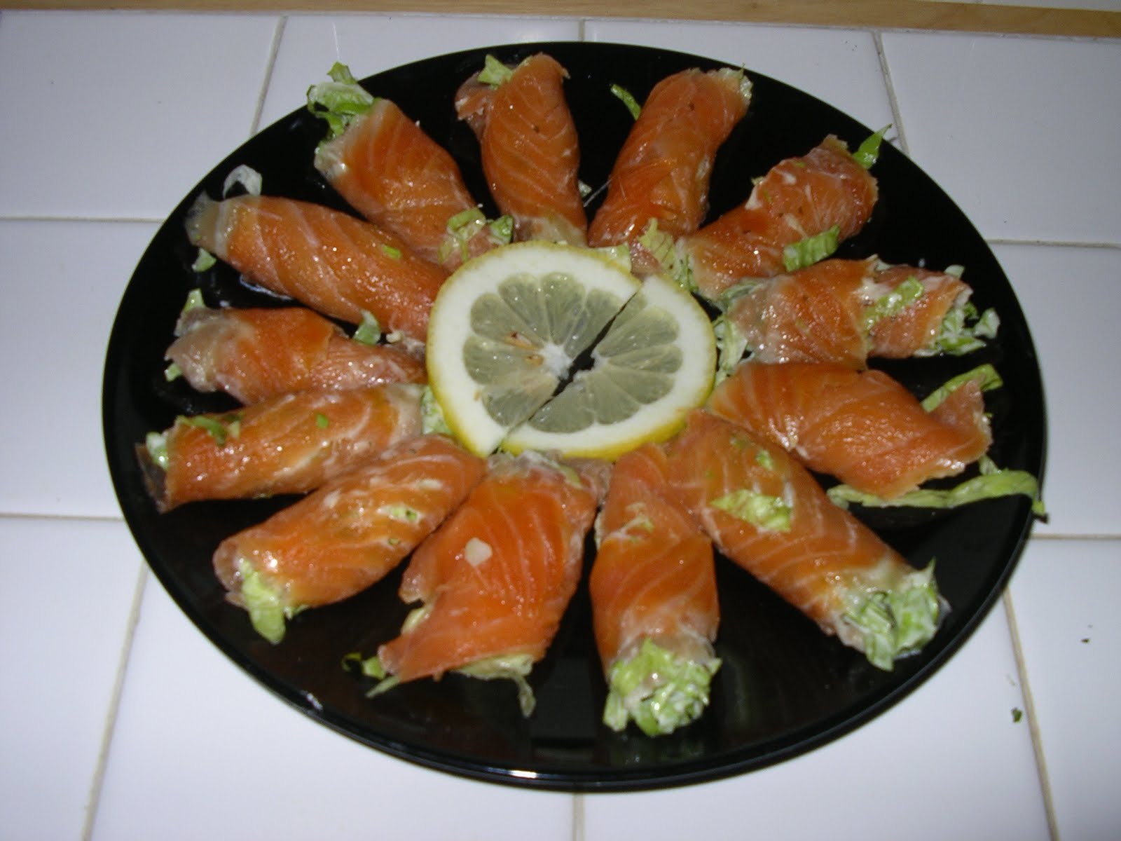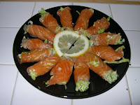 - Mezclamos el salmón desmigado con su salsa y la mayonesa y rellenamos con esta mezcla el salmón ahumado y lo adornamos con lechuga rizada.