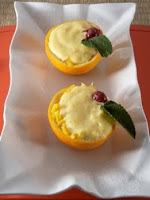 -Rellena las naranjas con esta mezcla y decora con una cereza confitada y una hoja de menta. Reserva en la nevera hasta el momento de servir y listo.