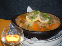 Picar 2 cebollas en pluma y freír con la zanahoria, los tomates y el pimentón rojo. Vaciar al caldo caliente agregar las papas y el vino y cocer 15 minutos. Agregar las presas de congrio y hervir 8 minutos luego los camarones y cocinar 2 minutos más. Retirar del fuego agregar la crema y servir espolvoreado con perejil